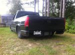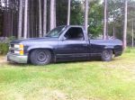 So i picked up this little beater truck last night, not a bad deal, runs nice. stock 4.3/auto. Came with a valid e-test and spare fenders and one door. (needed) rear is on air but just at a preset level, no managemnt or tank etc. very nicely done notch and custom rear frame. Front is on dropped spindles and cut lowering springs. It hasnt been aligned since lowering and its got a ton of negative camber and is toed in lots. It actually drives down the highway nice considering. The front crossmember is just about 1.5 inches off mother earth so there is zero chance its going on a drive up alignment rack. So my options are, eyeball and level and add shims to get camber back then tape measure toe settimg, or find a shop that has a drive on inground rack and pay. I relisted it on Kijiji but for the $1300 ihave in it i may keep it and give it to my kid as a daily/toy to screw around with.